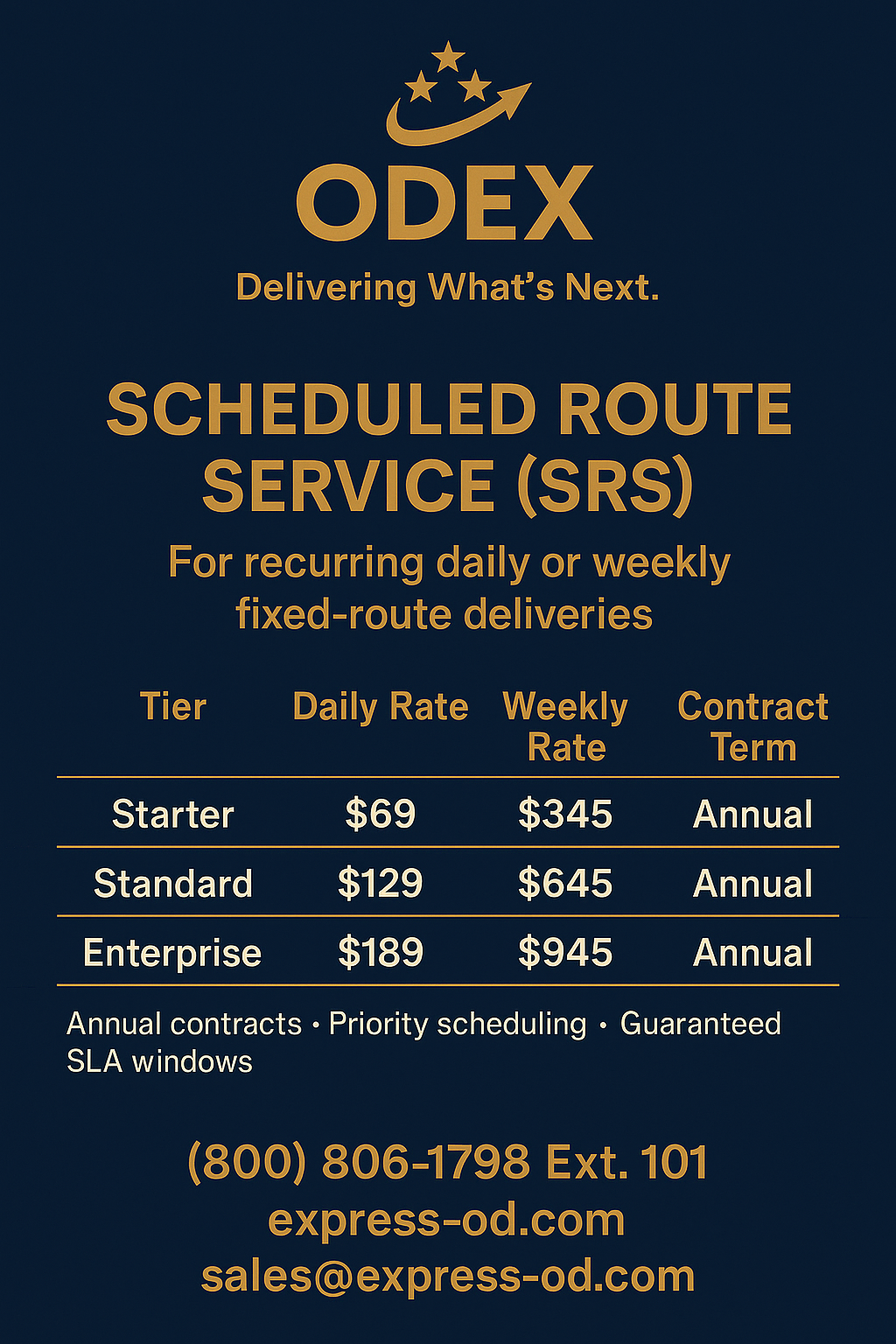 Let’s work together Company name: * Point of contact name: * Email * Phone * (###) ### #### What services are you interested in? Lite Membership Starter Membership Standard Membership Enterprise Membership Scheduled Route Service Message / Notes / Questions: Thank you! On Demand Express is the only prime-style courier. Our model is created to provide you with world-class service in a pricing model that provides true predictability and scalability. We will follow-up with within 24 hours for an introductory call. As always please feel free to call us at your convenience: (800) 806-1798, ext 101. Thank you for your time, look forward to partnering together to deliver what’s next! World-class service in a pricing model designed for you We’re the local prime-style courier for businesses - predictable flat-rate pricing, guaranteed delivery windows & friendly branded drivers.